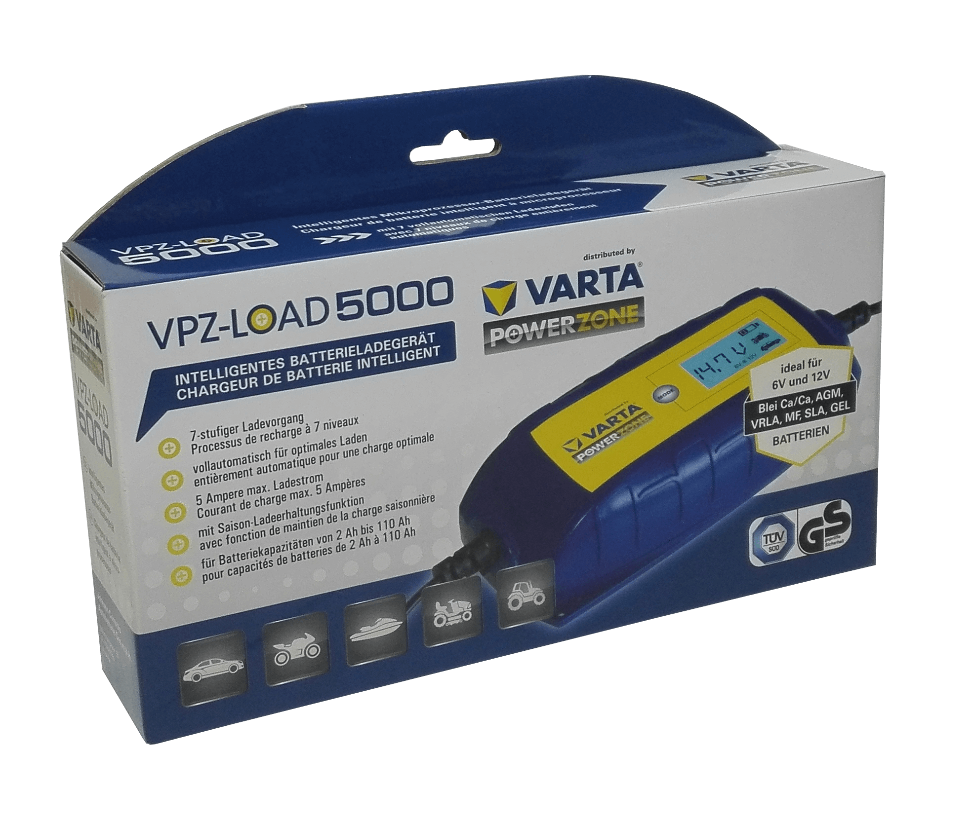Chargeur Haute Fréquence 6 et 12 volts automatique 5 A. Recharge et maintien les batteries 6 volts et 12 volts jusqu'à 140 Ah. Après avoir sélectionné le tension de batterie, le chargeur Varta lance la recharge complète de votre batterie et s'arrête seul en passant en mode veille et maintenance si vous deviez laisser votre véhicule longuement arrêté.